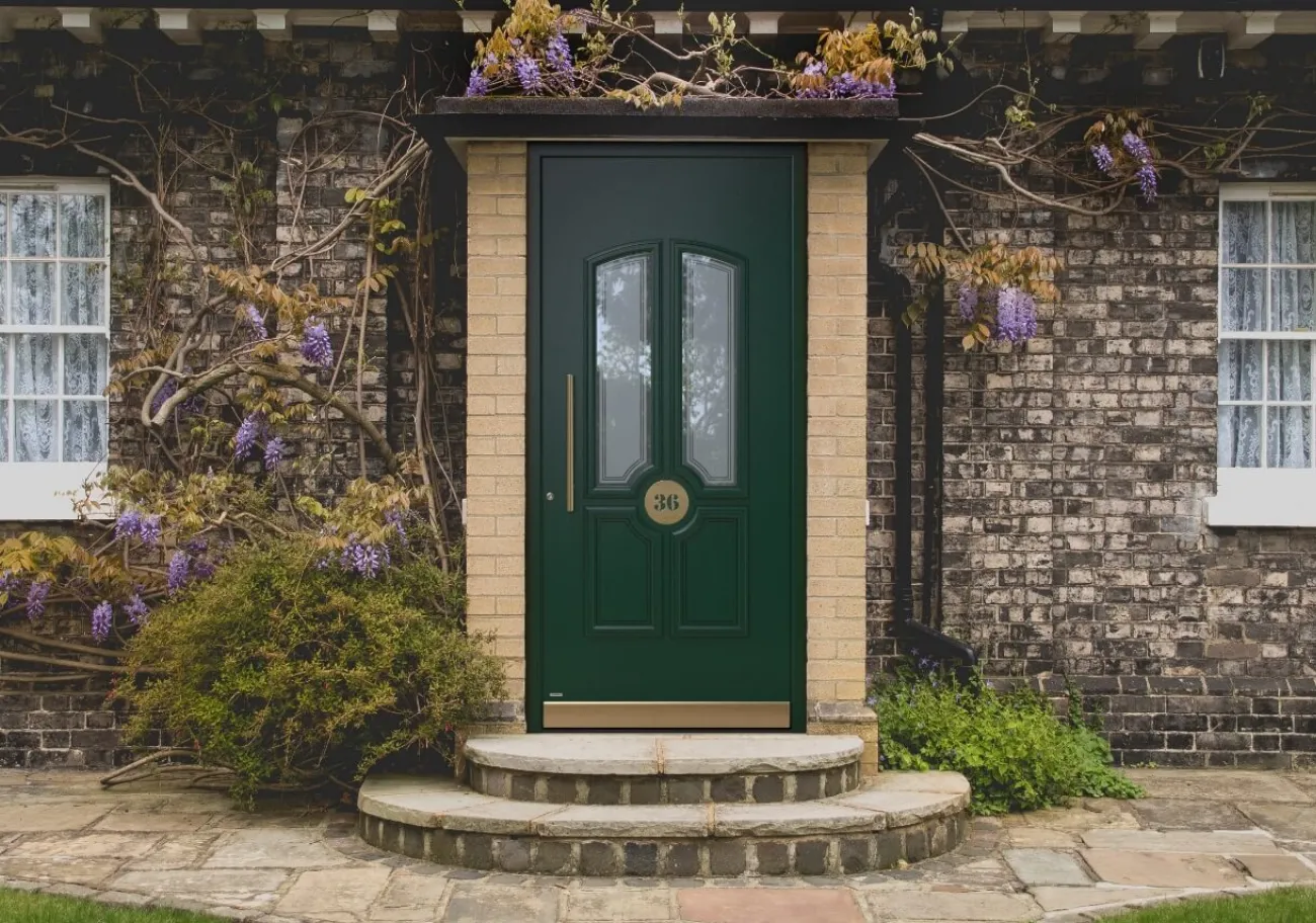 Wie wird eine grüne Haustür in Szene gesetzt?