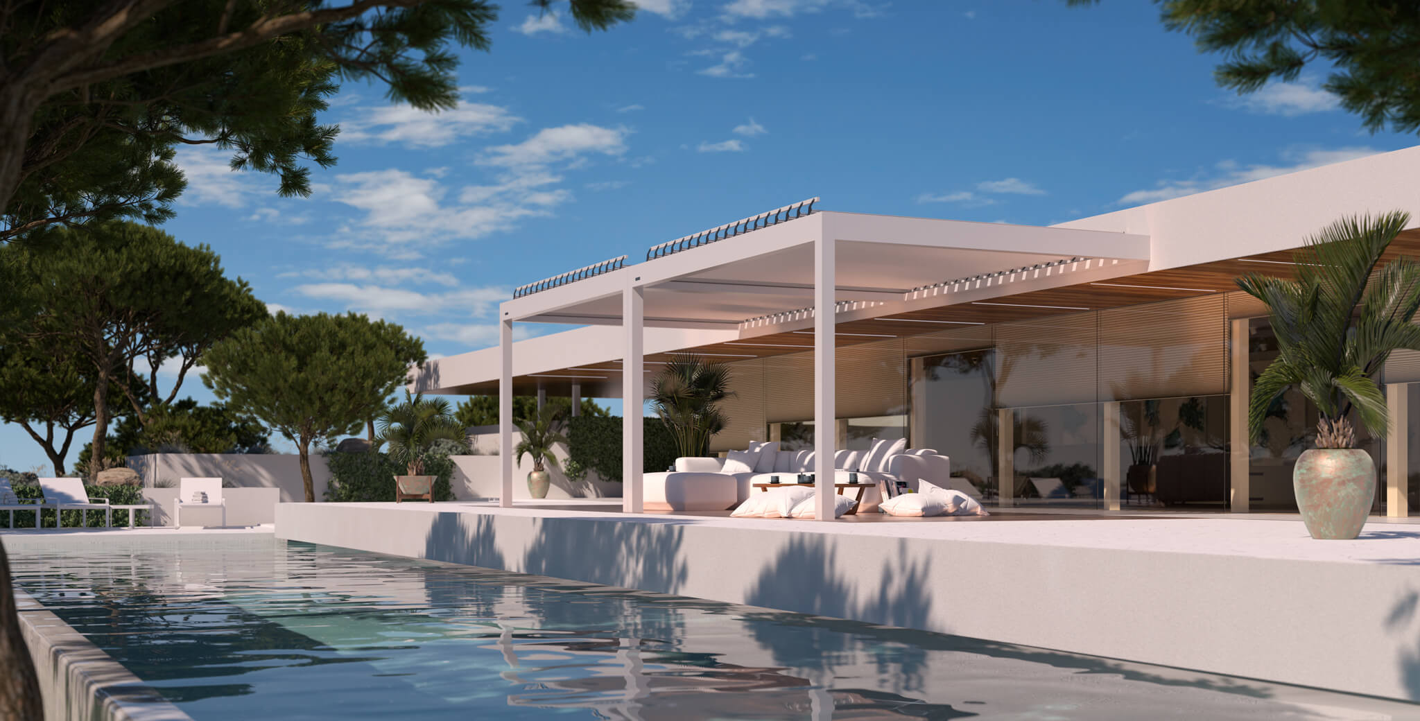 Erleben Sie unvergleichlichen Komfort – dank modernem Zubehör, das Ihre Aluminium-Pergola in einen paradiesischen Ort im Garten oder auf der Terrasse verwandelt: Dazu zählen motorisierte, atmungsaktive ZIP-Screens mit integriertem Insektenschutz, senkrechte Windschutz-Glasschiebepaneele, dimmbare LED-Beleuchtungsmodule, Wettersensoren für eine vollautomatische Steuerung und Steuereinheiten wie der Somfy Nina Remote Control.