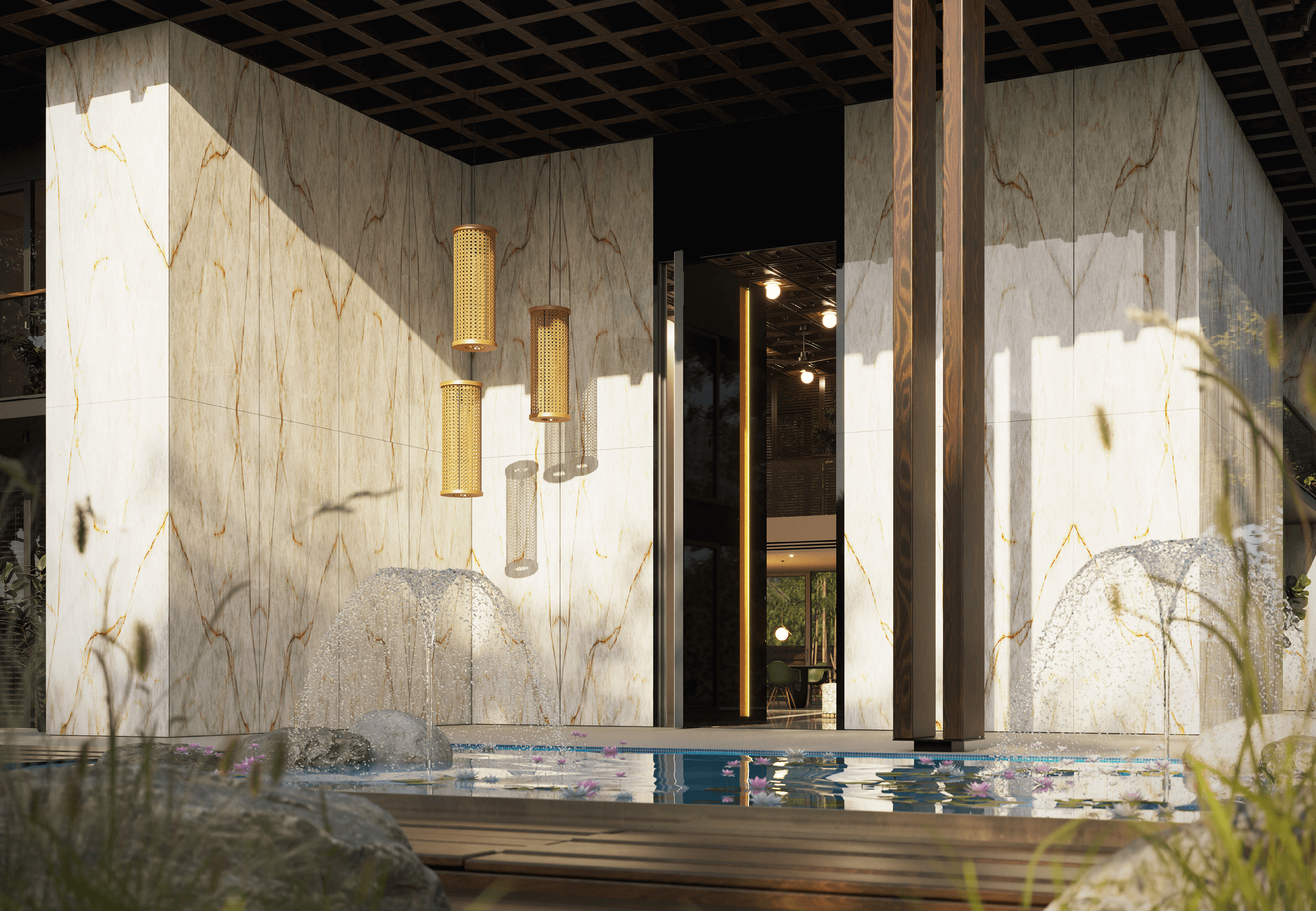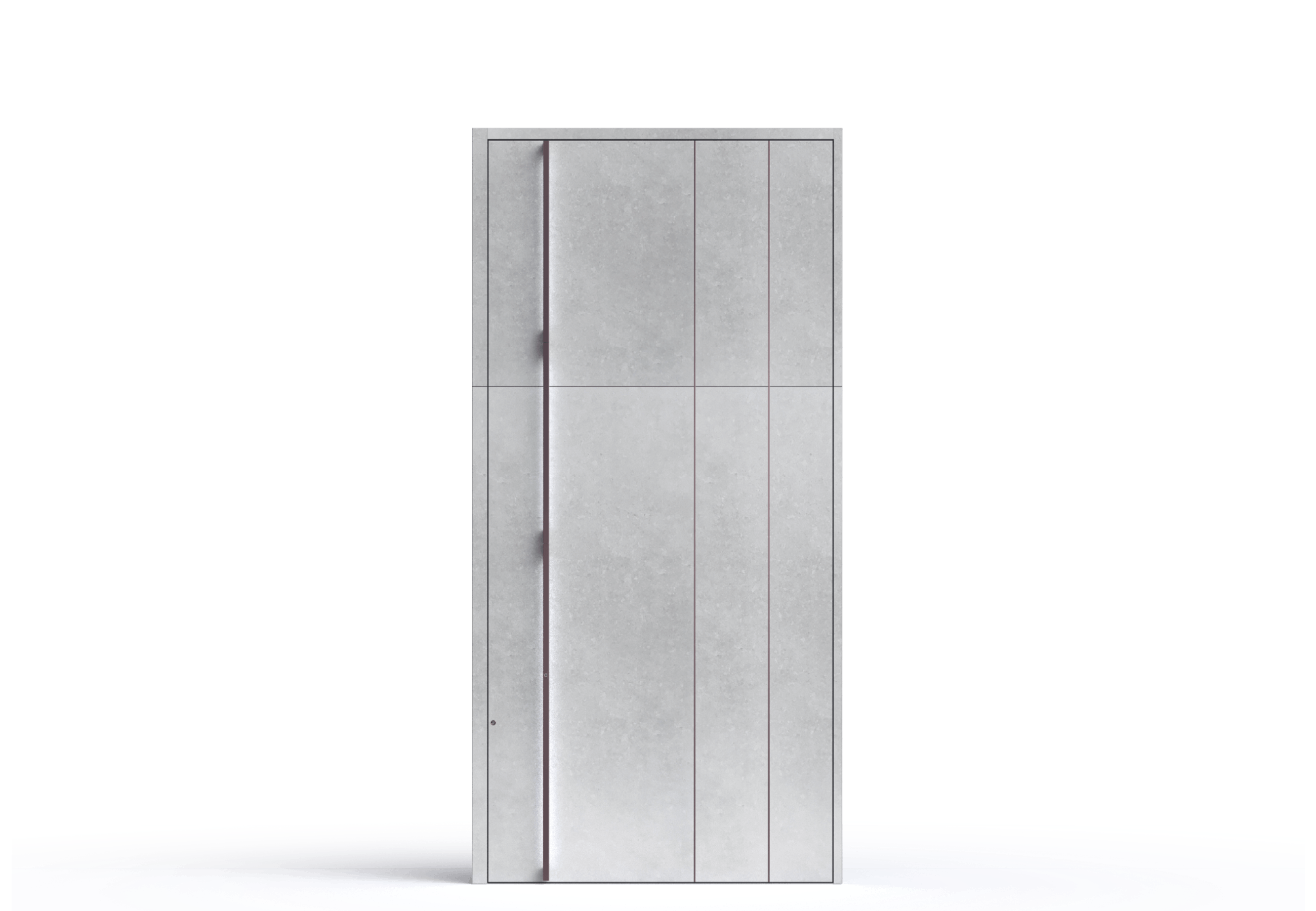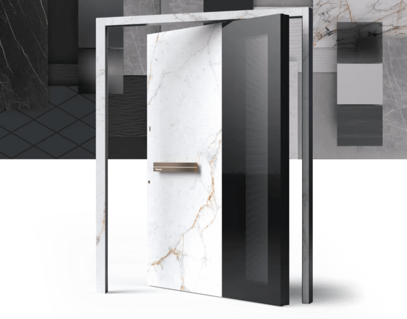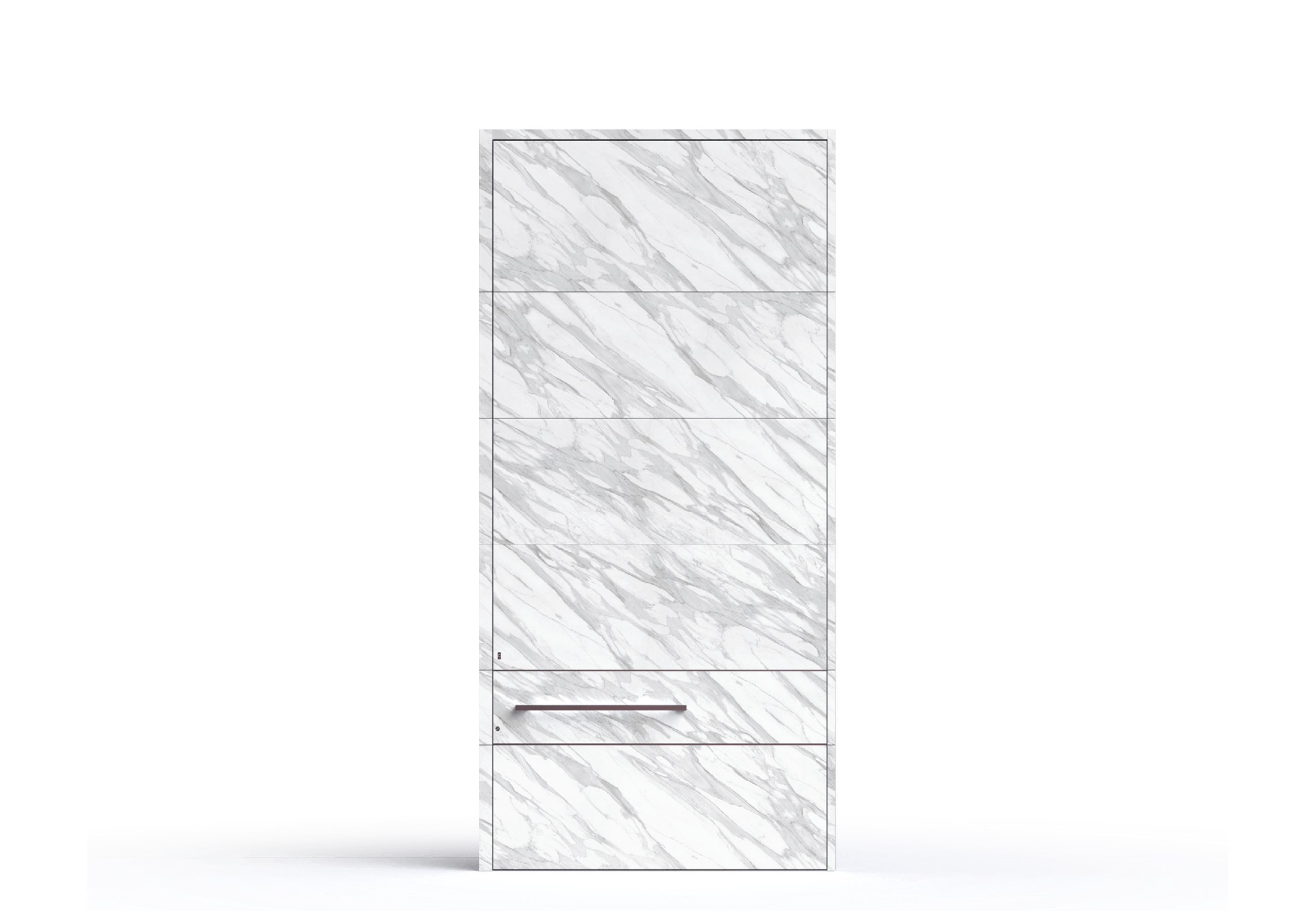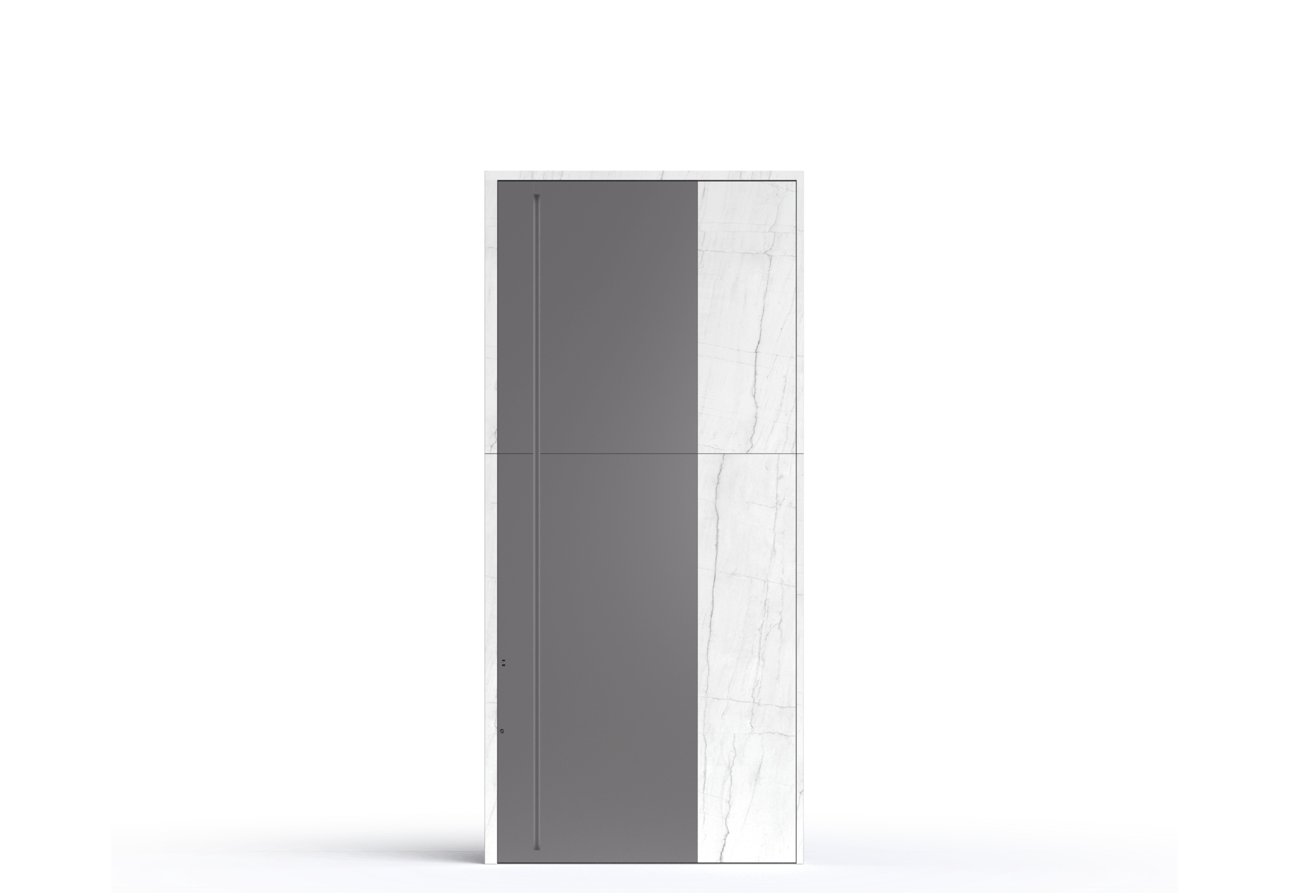 Diese atemberaubende Pivot-Tür verfügt über eleganten gesinterten Stein in der Abu Dhabi White-Edition, ergänzt durch fünflagiges dekoratives, Deckglas mit einem auffälligen Pirnar Grey II-Motiv. Der anspruchsvolle Griff ist mit SmartLux-Beleuchtung und einer PVD-Beschichtung in Copper Dusk versehen, während der SecuroSmart-Fingerscanner und das Armo Comfort Electro-System für erhöhte Sicherheit sorgen.