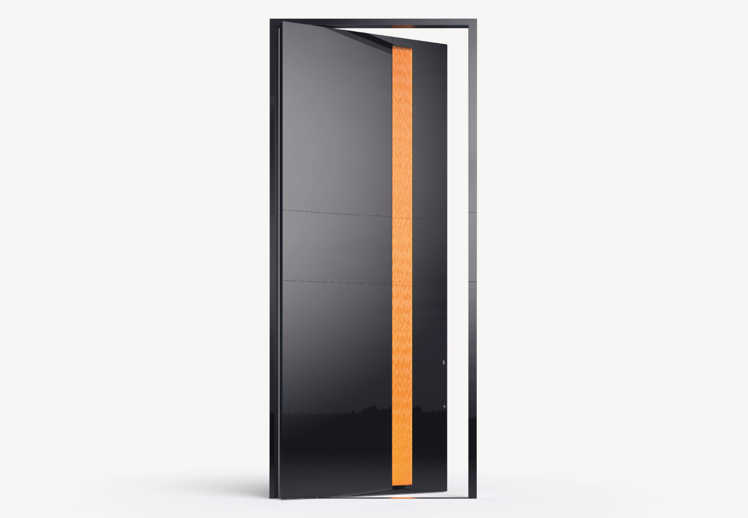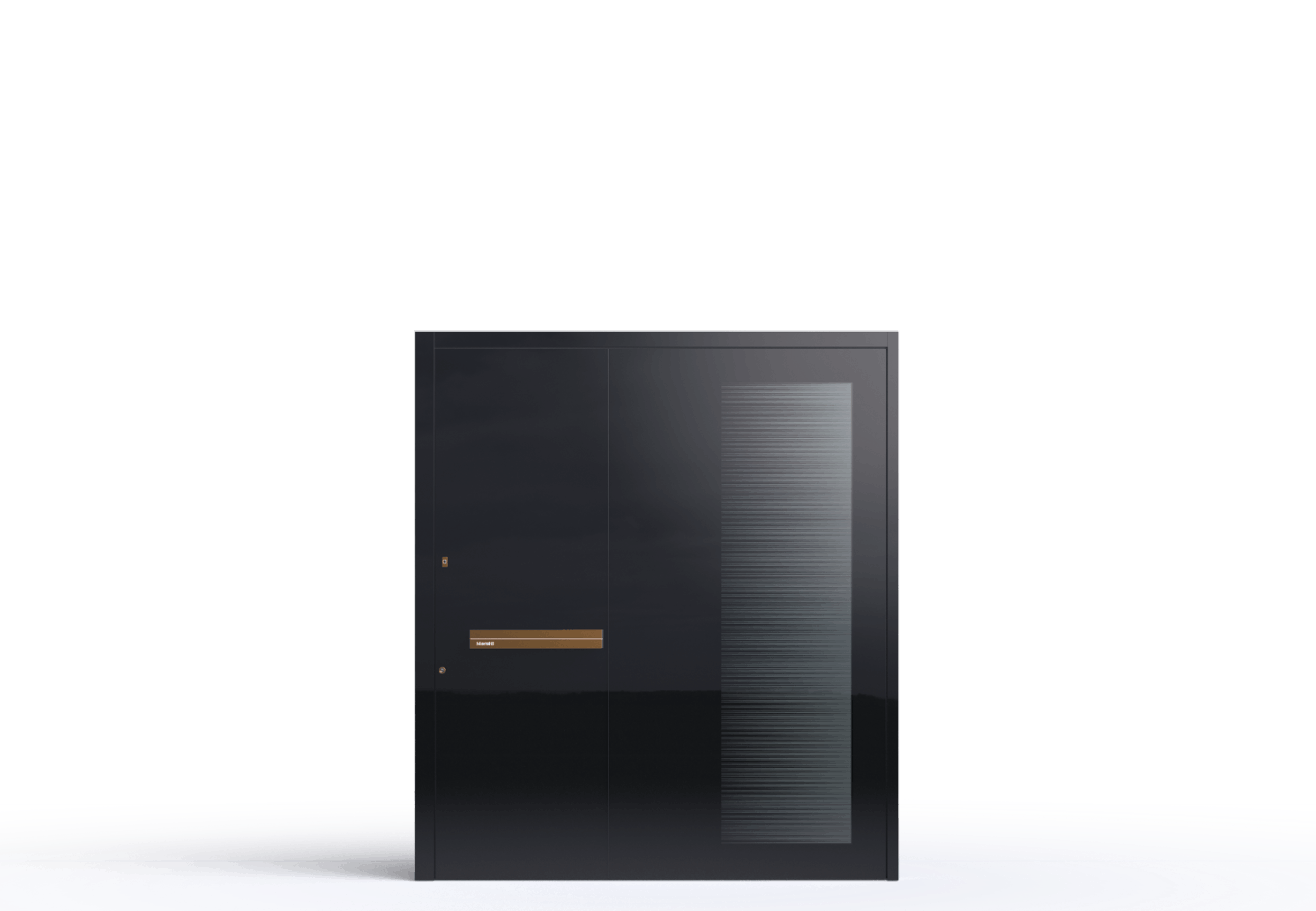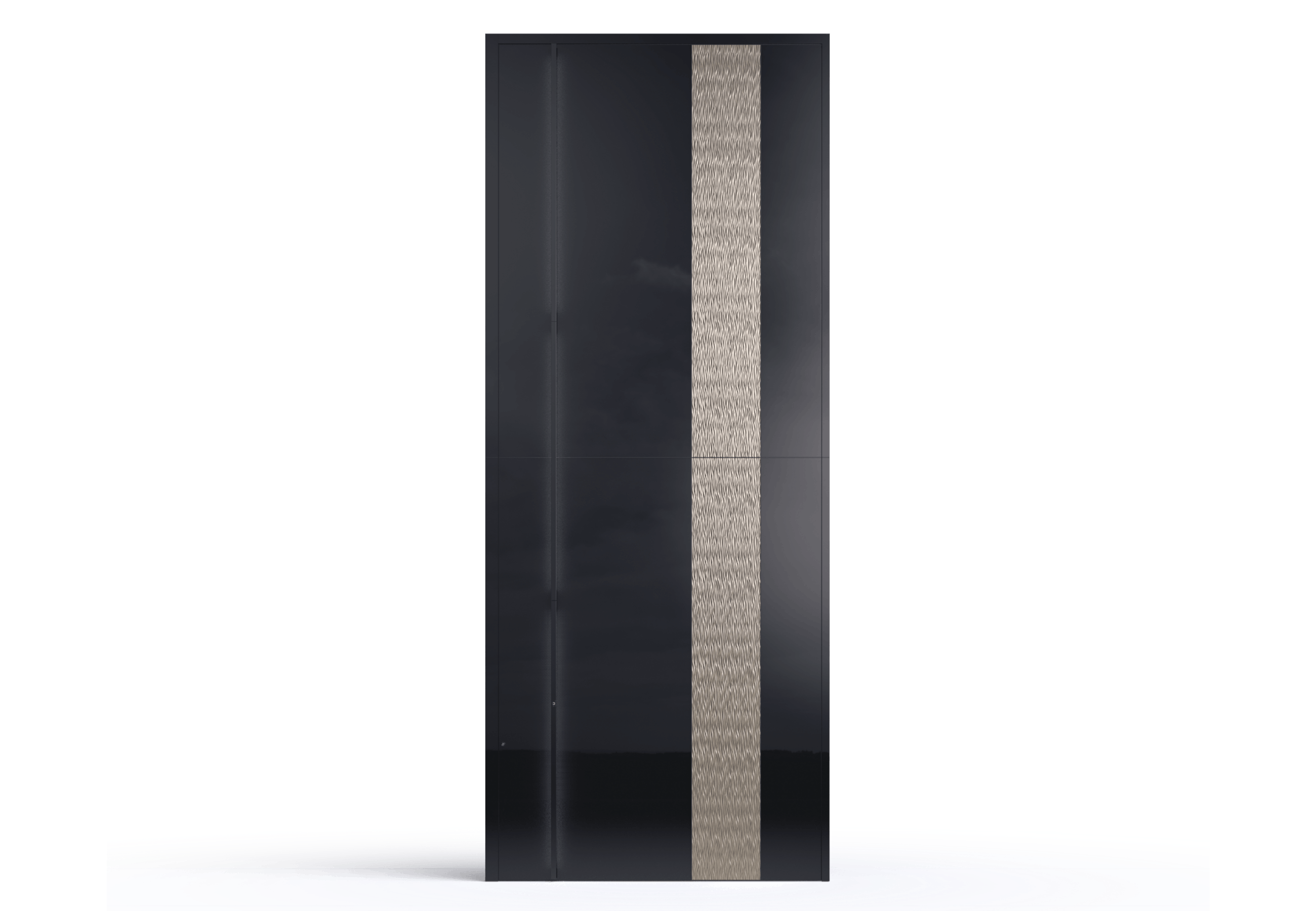 Diese auffällige Pivot-Tür besteht aus robustem Aluminium und verfügt über eine luxuriöse PVD-Beschichtung in Golden Honey. Sie wird elegant durch dekoratives, Deckglas in Night Sky Gloss akzentuiert und ist mit dem Angle Altum-Griff ausgestattet. Der SecuroSmart-Fingerscanner, kombiniert mit dem Armo Comfort Electro-Verschlusssystem, gewährleistet eine robuste Sicherheit.