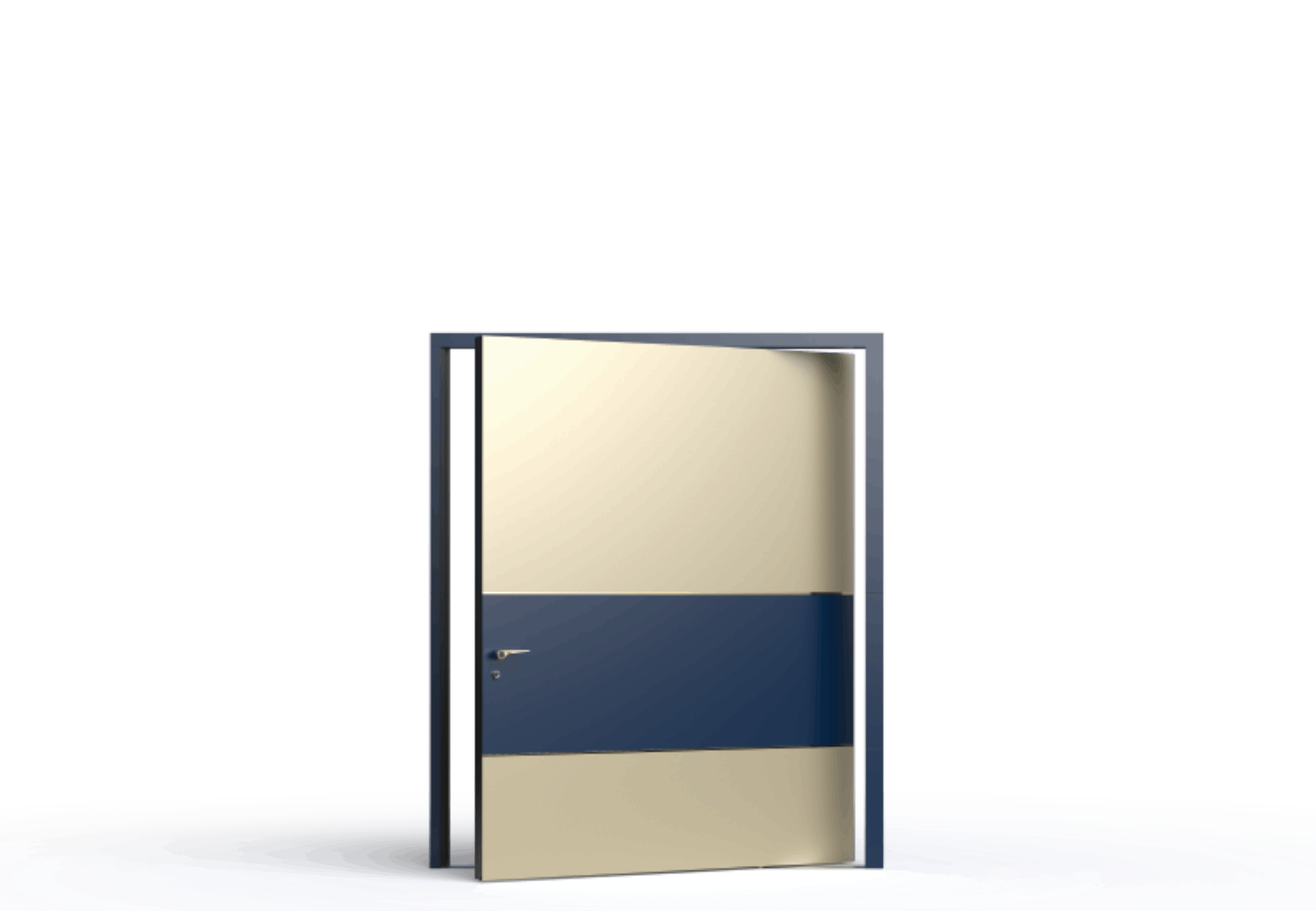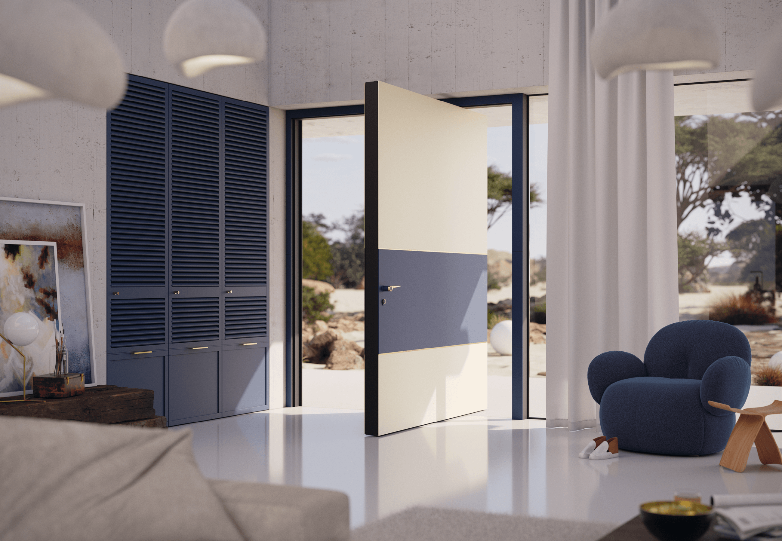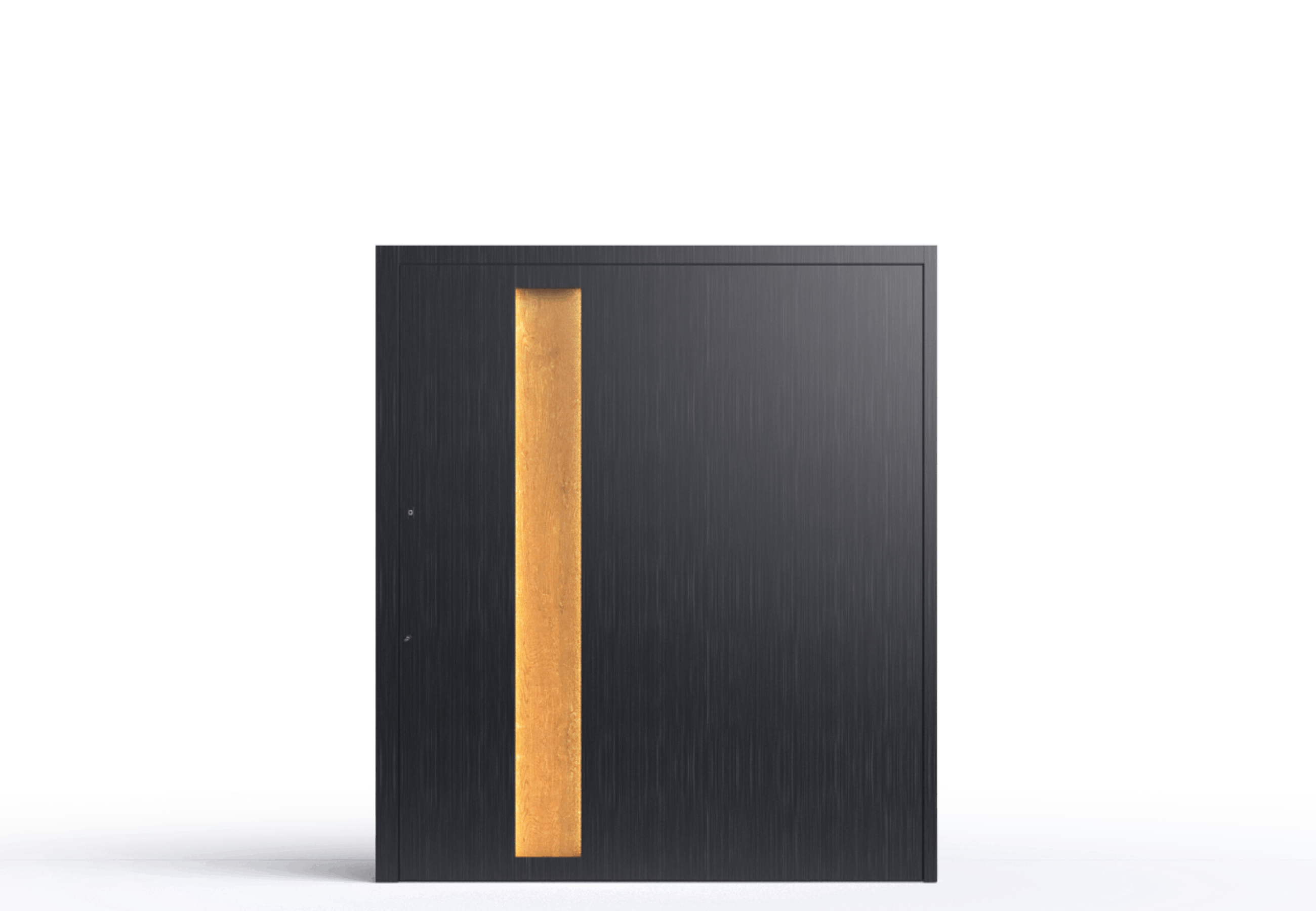 Diese auffällige Pivot-Tür besteht aus robustem Aluminium und verfügt über eine luxuriöse PVD-Beschichtung in Golden Honey. Sie wird elegant durch dekoratives, Deckglas in Night Sky Gloss akzentuiert und ist mit dem Angle Altum-Griff ausgestattet. Der SecuroSmart-Fingerscanner, kombiniert mit dem Armo Comfort Electro-Verschlusssystem, gewährleistet eine robuste Sicherheit.