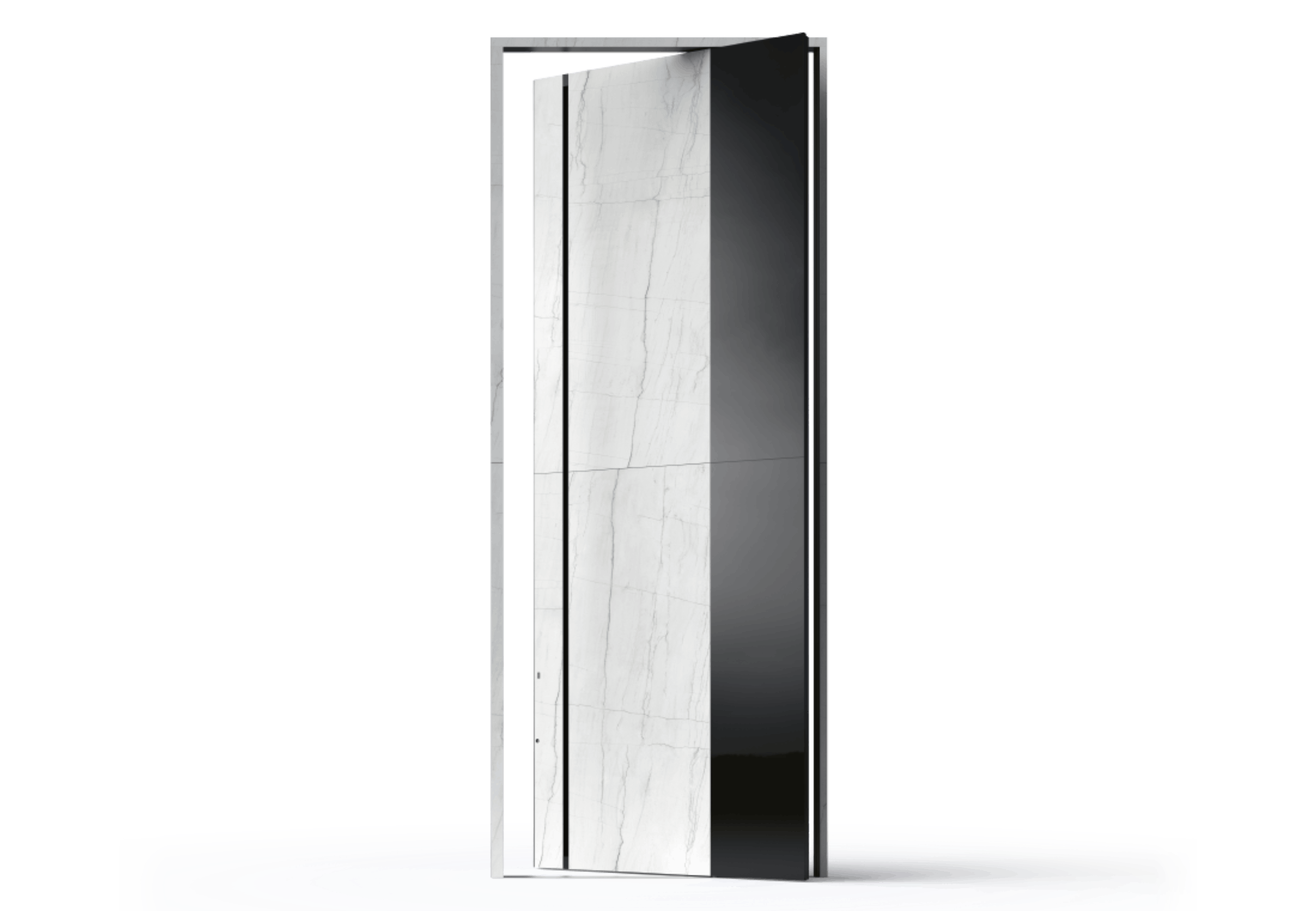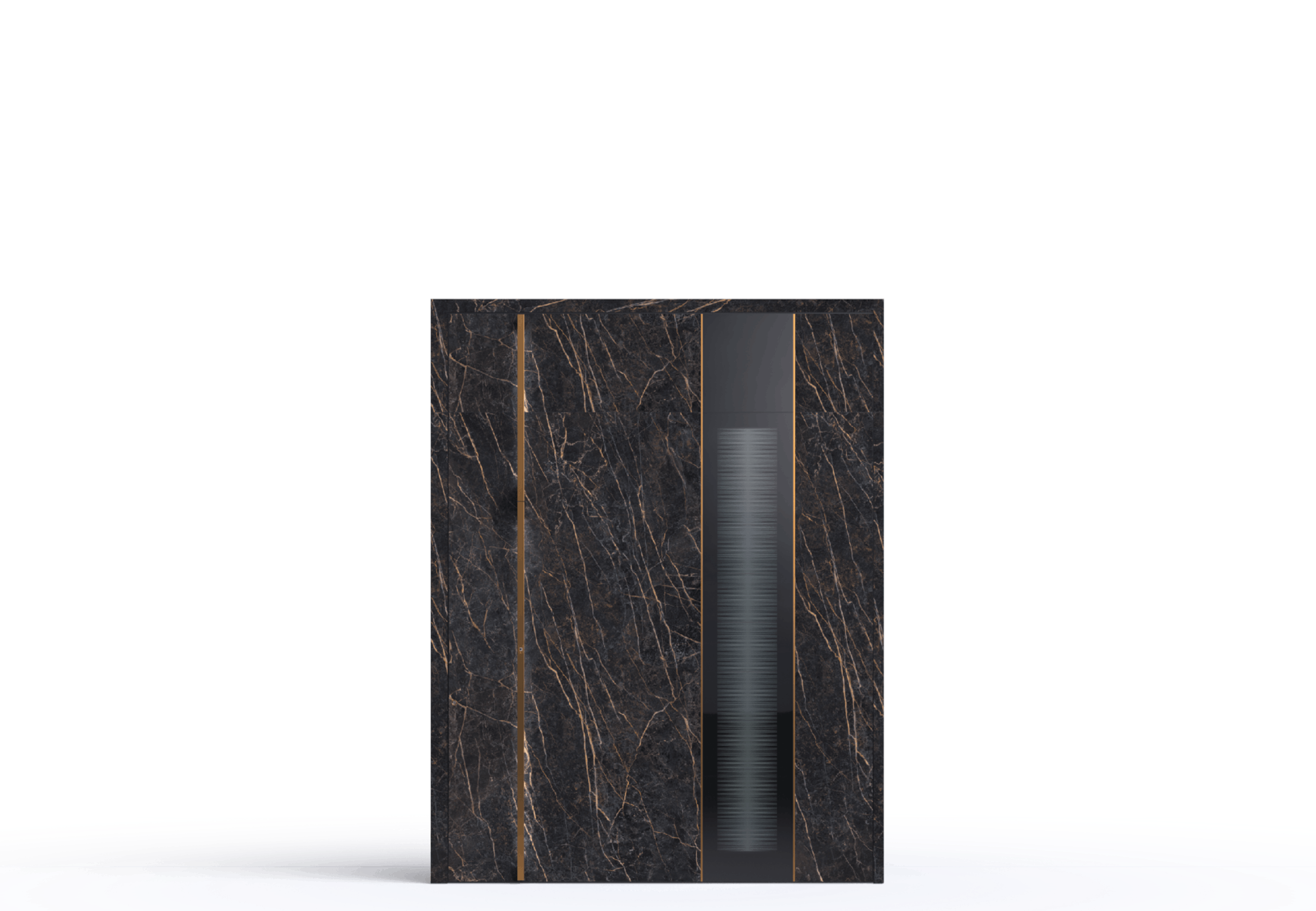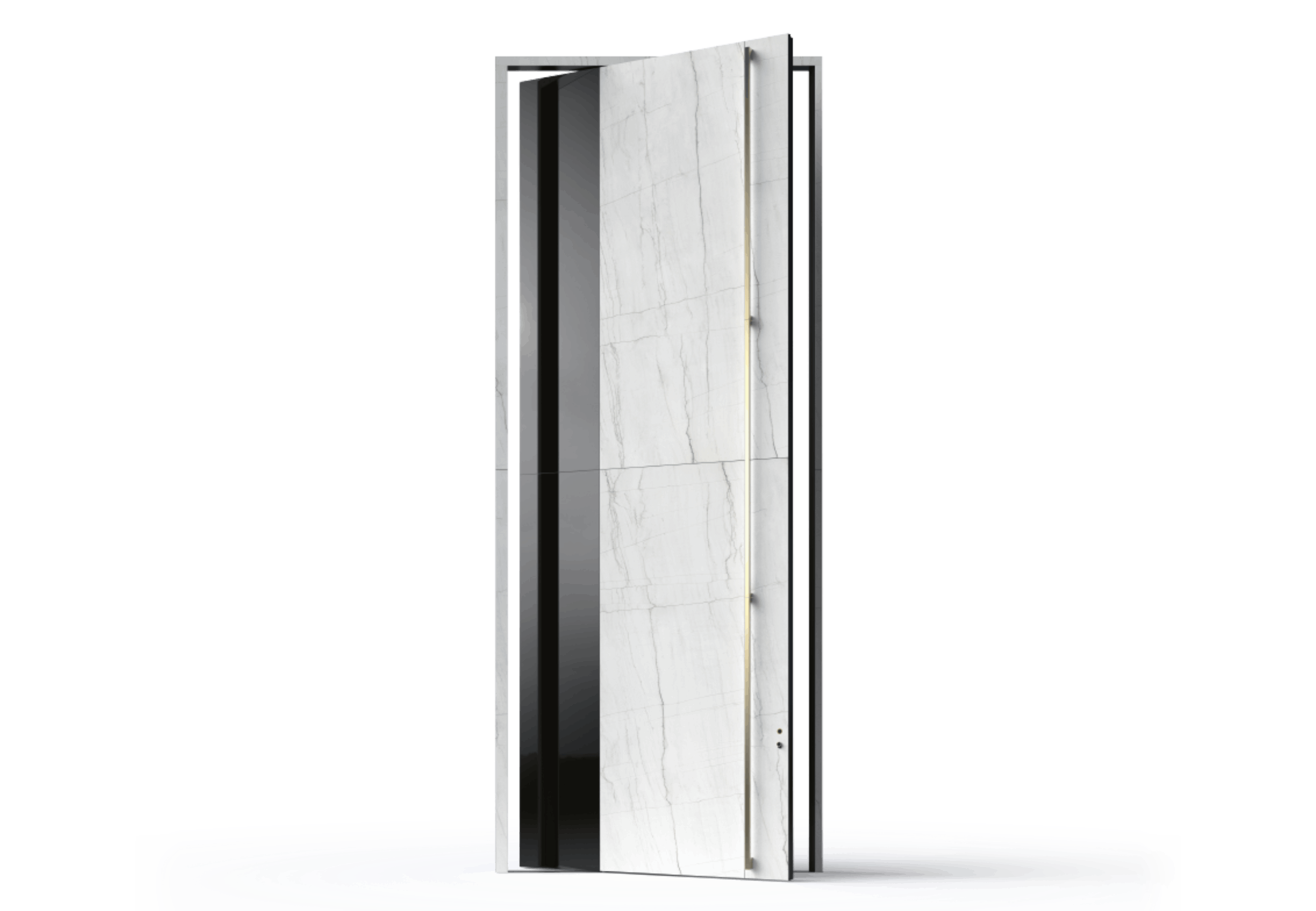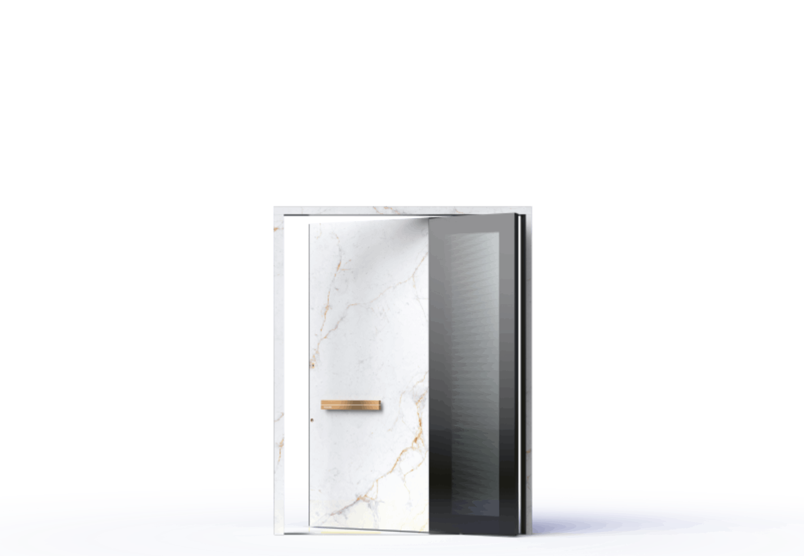 Diese fesselnde Pivot-Tür ist aus luxuriösem gesintertem Stein in der Mont Blanc-Edition gefertigt und nahtlos mit dekorativem, Deckglas in Night Sky Gloss sowie einer PVD-Beschichtung in Volcanic Shadow kombiniert. Sie verfügt über einen eingelassenen Griff mit SmartLux-Beleuchtung und beinhaltet einen SecuroSmart-Fingerscanner, ergänzt durch das Omnilock-Verschlusssystem für optimale Sicherheit.