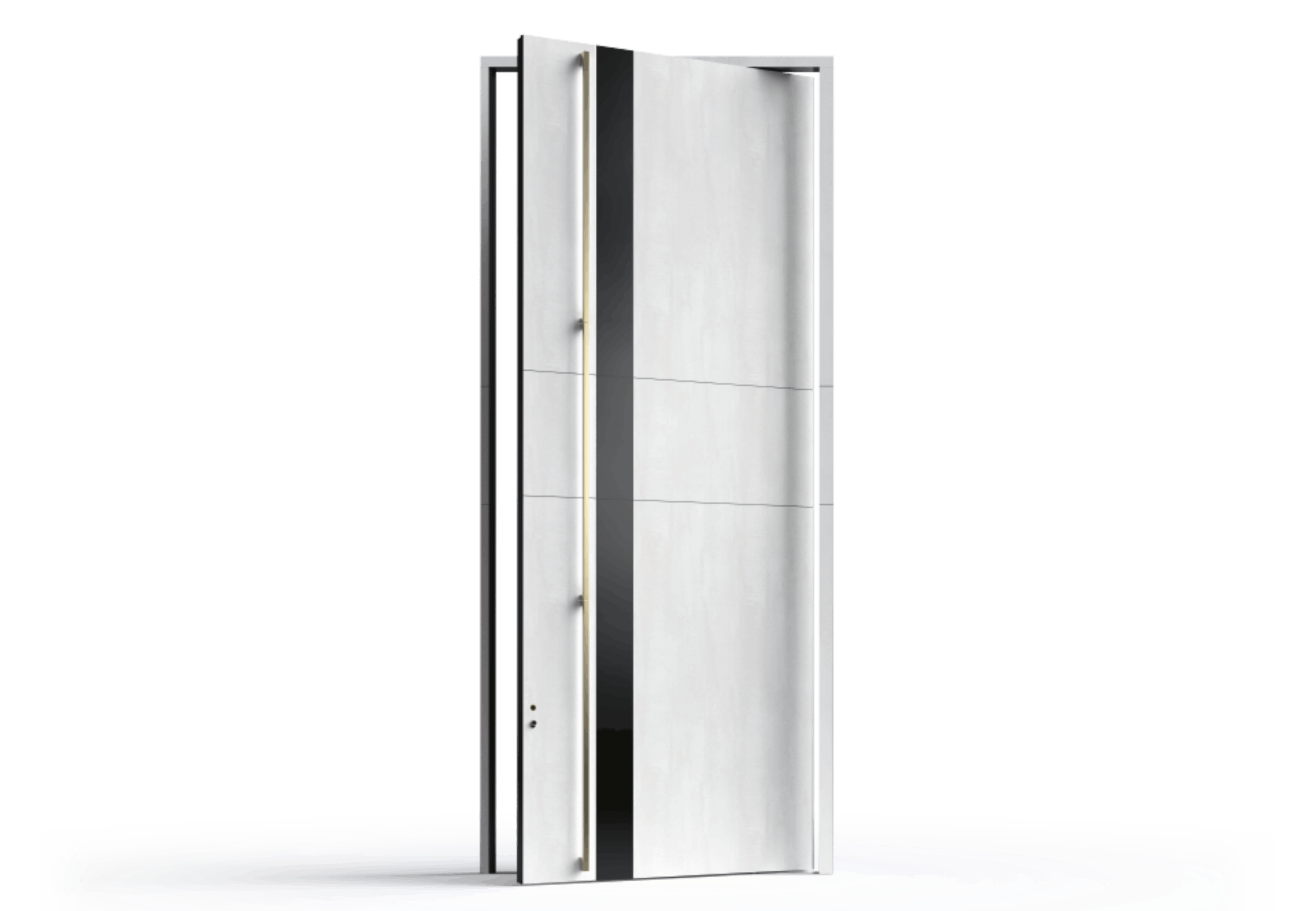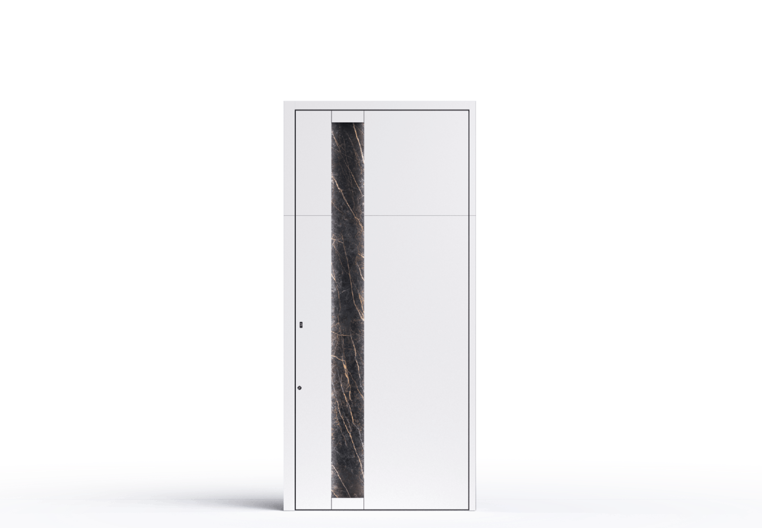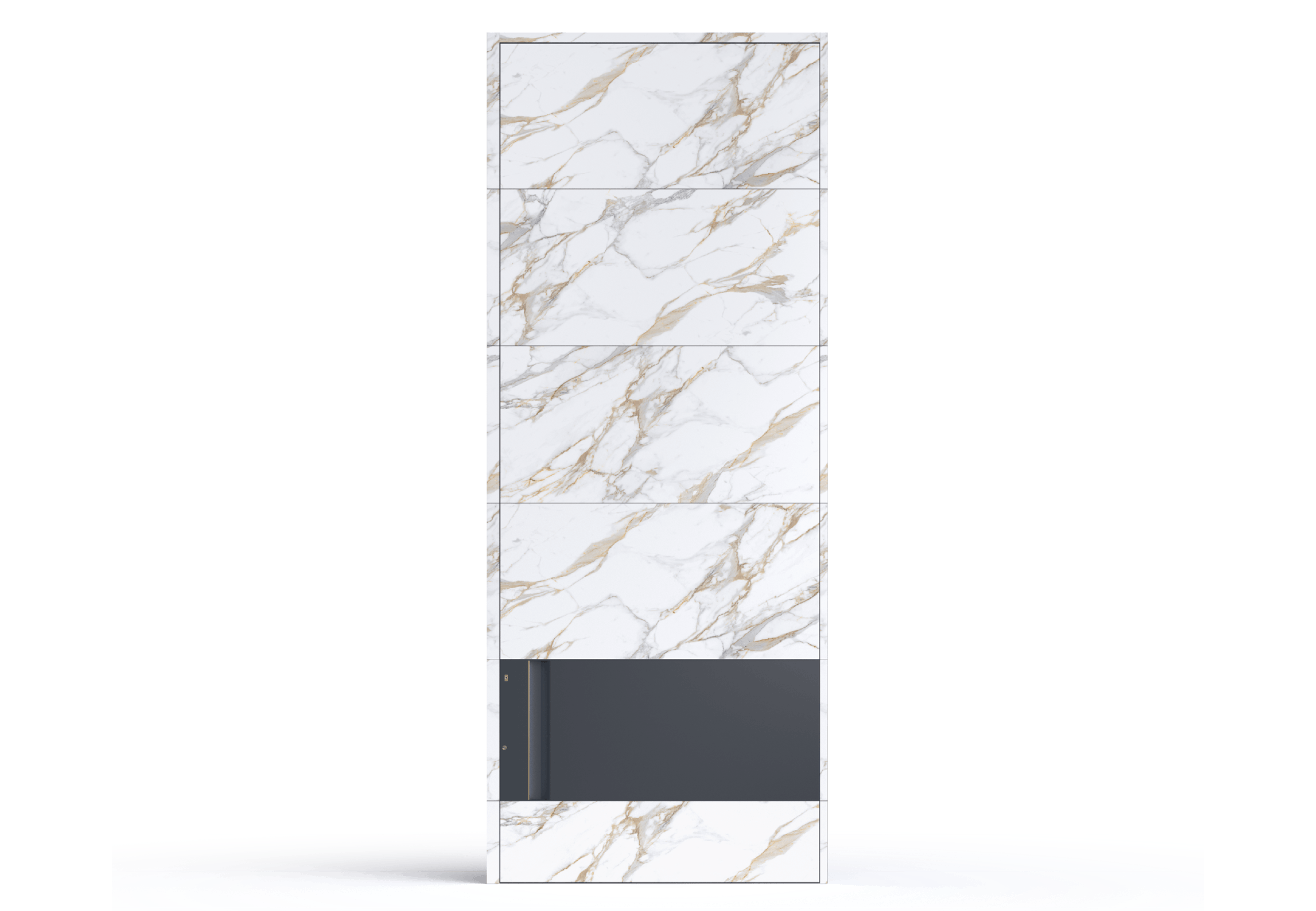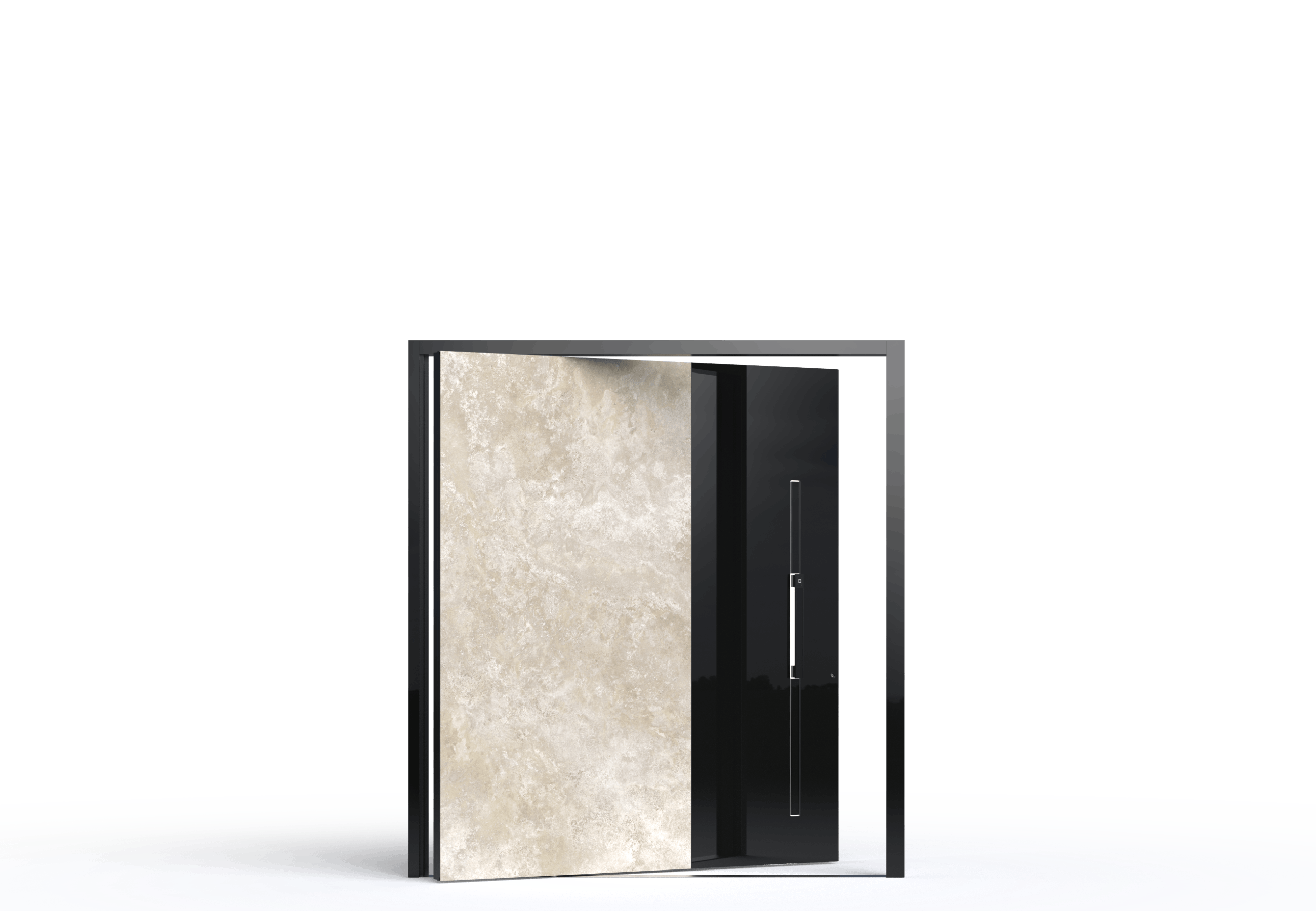 Diese fesselnde Pivot-Tür ist aus luxuriösem gesintertem Stein in der Mont Blanc-Edition gefertigt und nahtlos mit dekorativem, Deckglas in Night Sky Gloss sowie einer PVD-Beschichtung in Volcanic Shadow kombiniert. Sie verfügt über einen eingelassenen Griff mit SmartLux-Beleuchtung und beinhaltet einen SecuroSmart-Fingerscanner, ergänzt durch das Omnilock-Verschlusssystem für optimale Sicherheit.