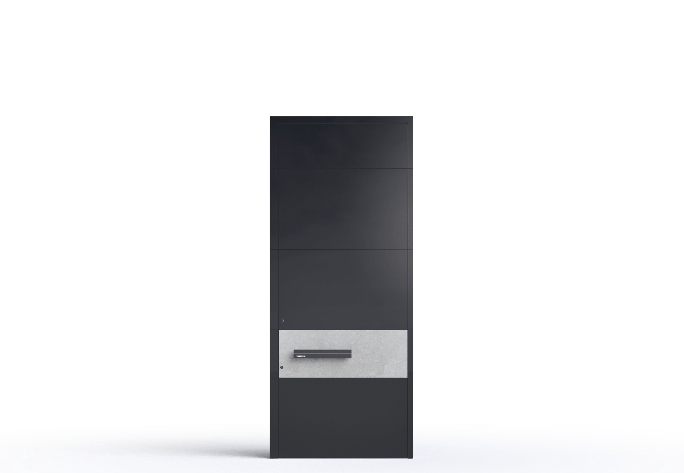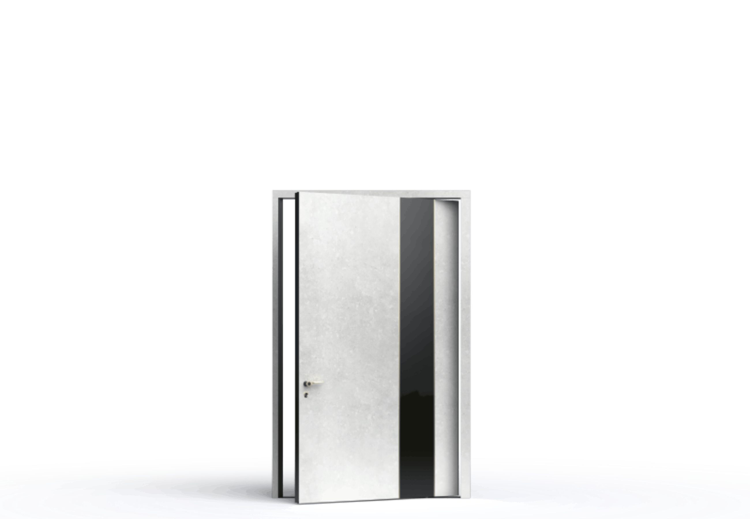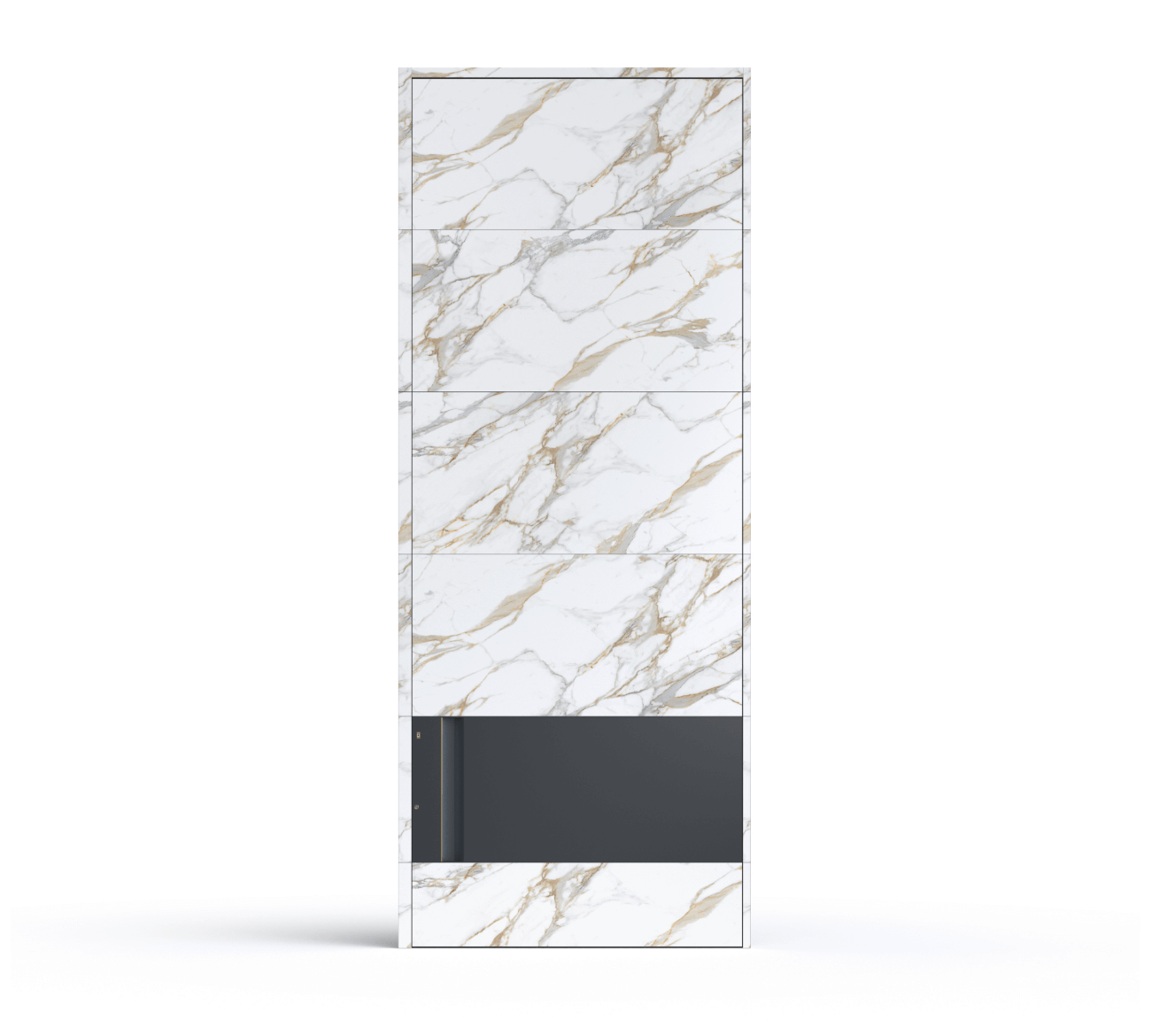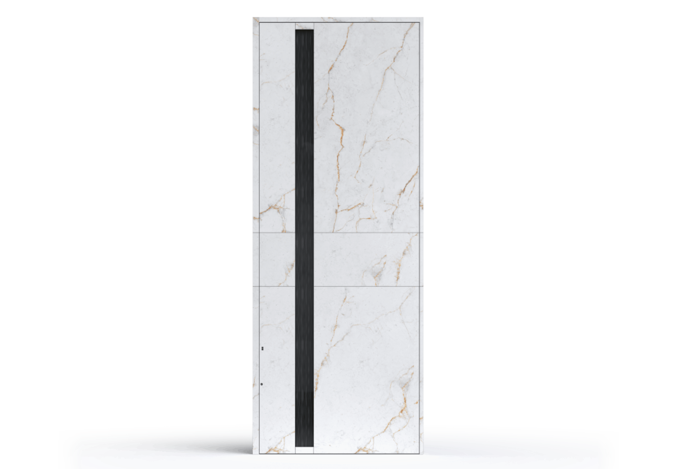Diese fesselnde Pivot-Tür ist aus luxuriösem gesintertem Stein in der Mont Blanc-Edition gefertigt und nahtlos mit dekorativem, Deckglas in Night Sky Gloss sowie einer PVD-Beschichtung in Volcanic Shadow kombiniert. Sie verfügt über einen eingelassenen Griff mit SmartLux-Beleuchtung und beinhaltet einen SecuroSmart-Fingerscanner, ergänzt durch das Omnilock-Verschlusssystem für optimale Sicherheit.