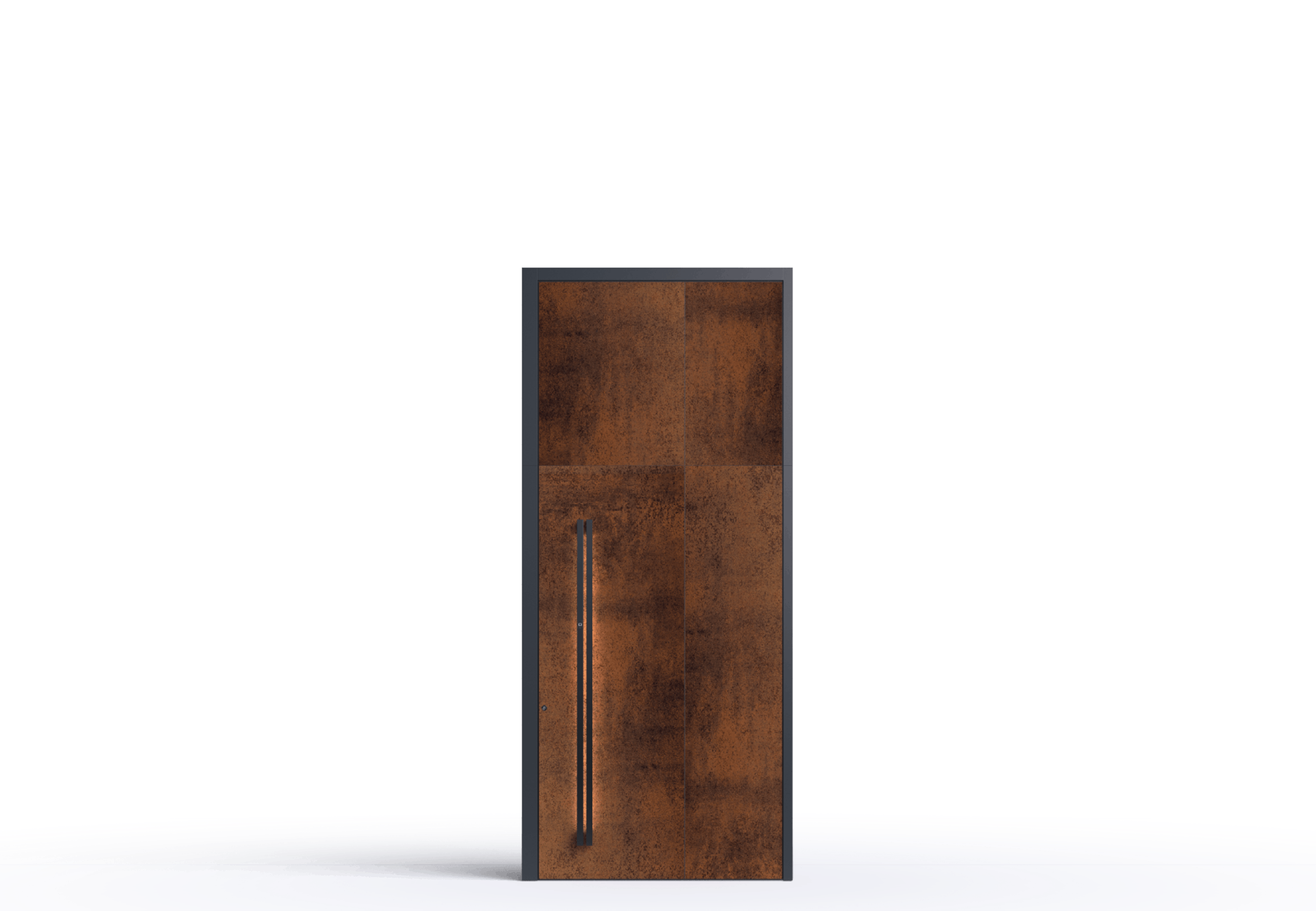 Diese elegante Pivot-Tür besteht aus langlebigem Aluminium, das mit einer beeindruckenden Holzimitat-Oberfläche in geölter Eiche veredelt ist. Sie wird ergänzt durch den eleganten Griff mit SmartLux-Beleuchtung und einer PVD-Beschichtung in Volcanic Shadow und enthält einen SecuroSmart-Fingerscanner sowie das Armo Comfort Electro-Verschlusssystem für überlegene Sicherheit.