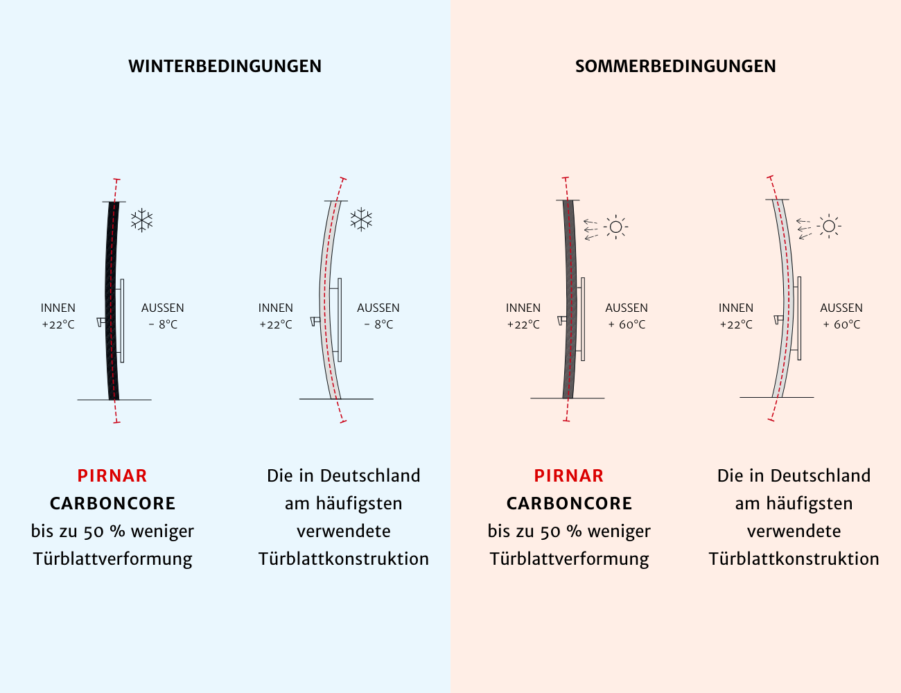 Unsere einzigartige CarbonCore-Konstruktion garantiert höchste Stabilität selbst bei außergewöhnlichen Türgrößen. Labortests bestätigen bis zu 50 % weniger Verformung des Türblatts durch Temperaturunterschiede im Vergleich zu herkömmlichen Konstruktionen. Deshalb sind Pirnar Pivot-Türen ideal für alle Klimazonen – von kalten alpinen bis zu heißen mediterranen und Wüstenregionen.