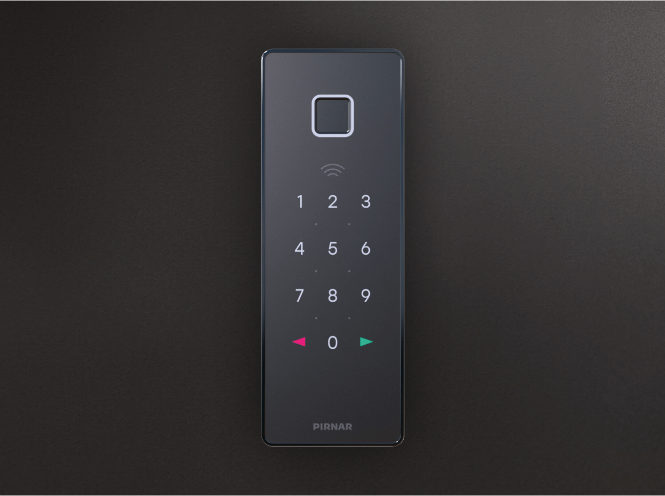 Das moderne Tastenfeld ermöglicht das Entriegeln mit verschiedenen PIN-Codes, die auf individuelle Bedürfnisse abgestimmt sind, sowie mit einer NFC-Karte. Es verfügt über einen integrierten Fingerscanner sowie eine kabellose Klingel – alles steuerbar über die Pirnar App.